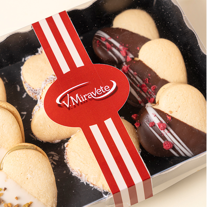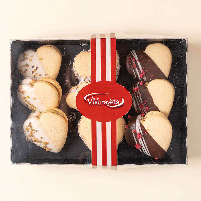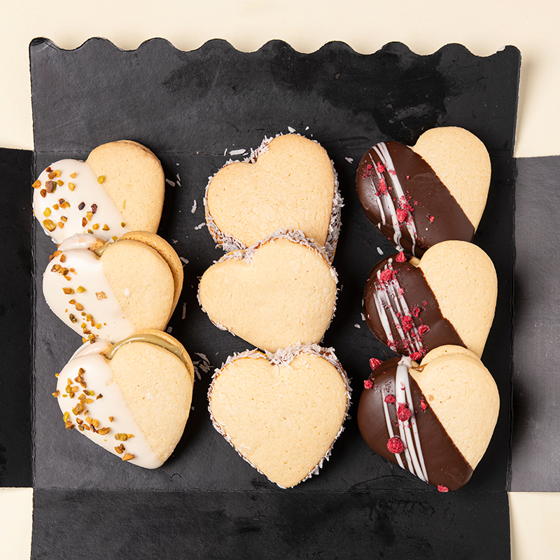Alfajores corazón de dulce de leche, chocolate blanco y chocolate con leche.